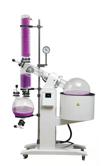 旋轉蒸發(fā)器是用無級調速使玻璃旋轉瓶恒速旋轉,物料在瓶壁形成大面積均勻薄膜,再由智能恒溫水浴鍋對旋轉瓶進行均勻加熱,在真空條件下高速蒸發(fā),溶媒蒸氣經高效玻璃冷凝器冷卻,回收于收集瓶。