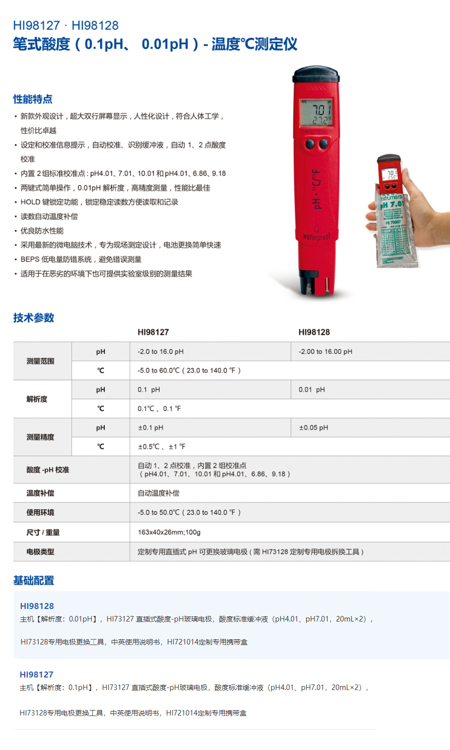 HI98128 測(cè)量范圍:-2.00 to 16.00 pH,精度:±0.05pH;HI98127 測(cè)量范圍:-2.0 to 16.0 pH,精度:±0.1pH;適用于現(xiàn)場(chǎng)或?qū)嶒?yàn)室,操作簡(jiǎn)單實(shí)惠,符合實(shí)驗(yàn)室測(cè)量標(biāo)準(zhǔn)。