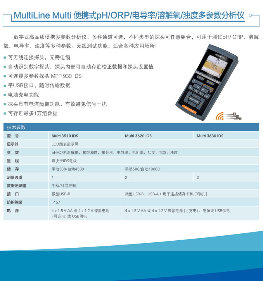 德國WTW-MultiLine Multi 3510 IDS便攜式單參數(shù)水質(zhì)檢測分析儀簡介