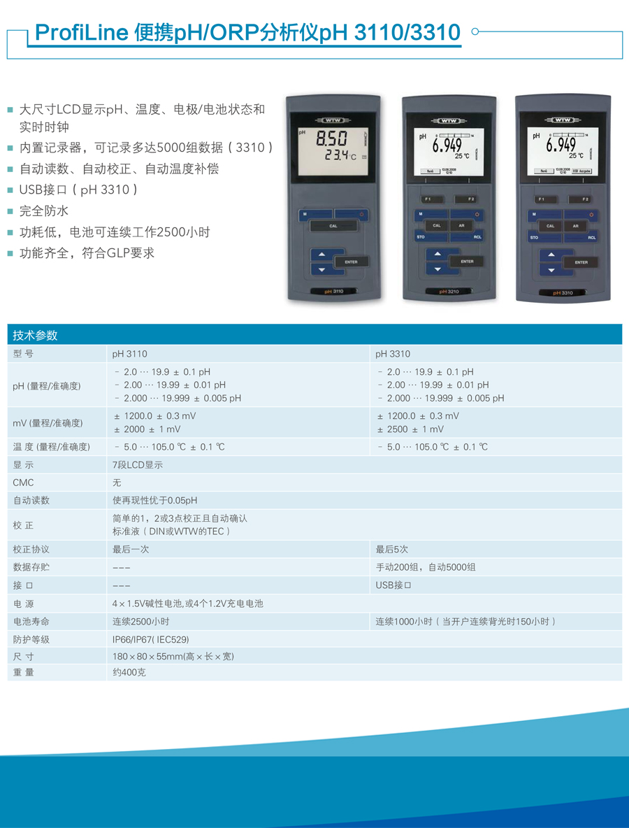 德國WTW ProfiLine PH3110/3210/3310手持式pH/mV測試儀可測量pH、mV和溫度,很高分辨率0.001pH;可連接各種標(biāo)準(zhǔn)PH復(fù)合電極或ORP電極。
