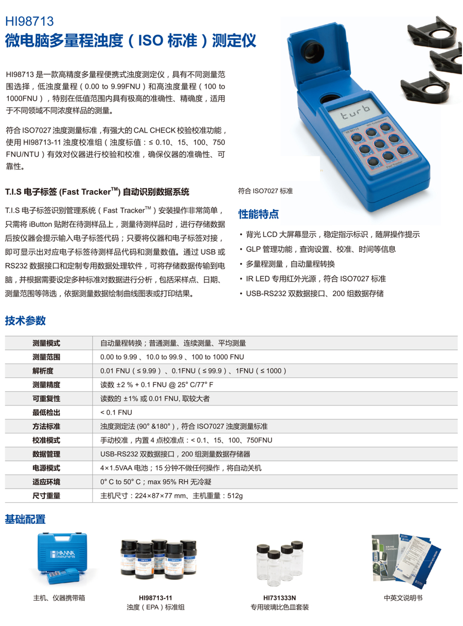 主機,HI98713-11 定制專用濁度(ISO)標(biāo)準(zhǔn)組(標(biāo)值@25°C:≤ 0.1、15、100、750 FNU),HI731333N 專用玻璃比色皿套裝,HI93703-58 玻璃比色杯潤滑劑,HI920005 T.I.S電子標(biāo)簽(5個),HI710006 AC230V/12VDC 電源適配器,中英文使用說明書,HI710134 定制專用儀器攜帶箱【溫馨提示:建議訂購HI93703-50比色皿清潔液和HI731318玻璃比色皿清潔布,用于玻璃比色皿清潔修復(fù),確保測量精度和讀數(shù)準(zhǔn)確度】