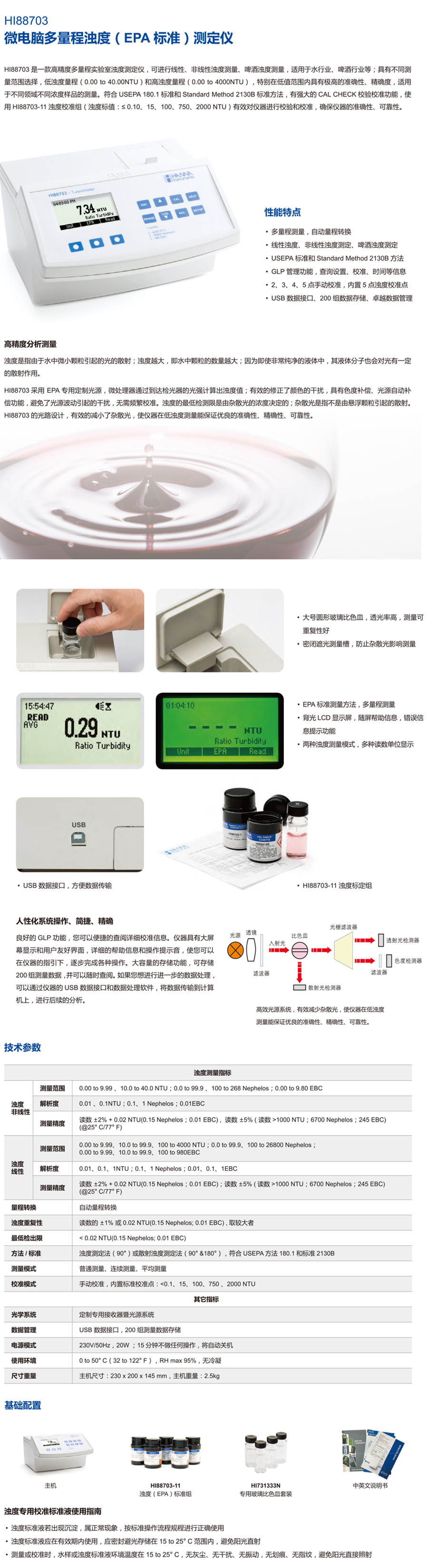 主機(jī),HI88703-11 定制專(zhuān)用濁度(EPA)標(biāo)準(zhǔn)組(標(biāo)值@25°C:≤ 0.1、15、100、750、2000 NTU),HI731333N 專(zhuān)用玻璃比色皿套裝【6個(gè)】,HI93703-58 玻璃比色杯潤(rùn)滑劑,HI710006 AC230V/12VDC 電源適配器,中英文使用說(shuō)明書(shū)【溫馨提示:建議訂購(gòu)HI93703-50比色皿清潔液和HI731318玻璃比色皿清潔布,用于玻璃比色皿清潔修復(fù),確保測(cè)量精度和讀數(shù)準(zhǔn)確度】