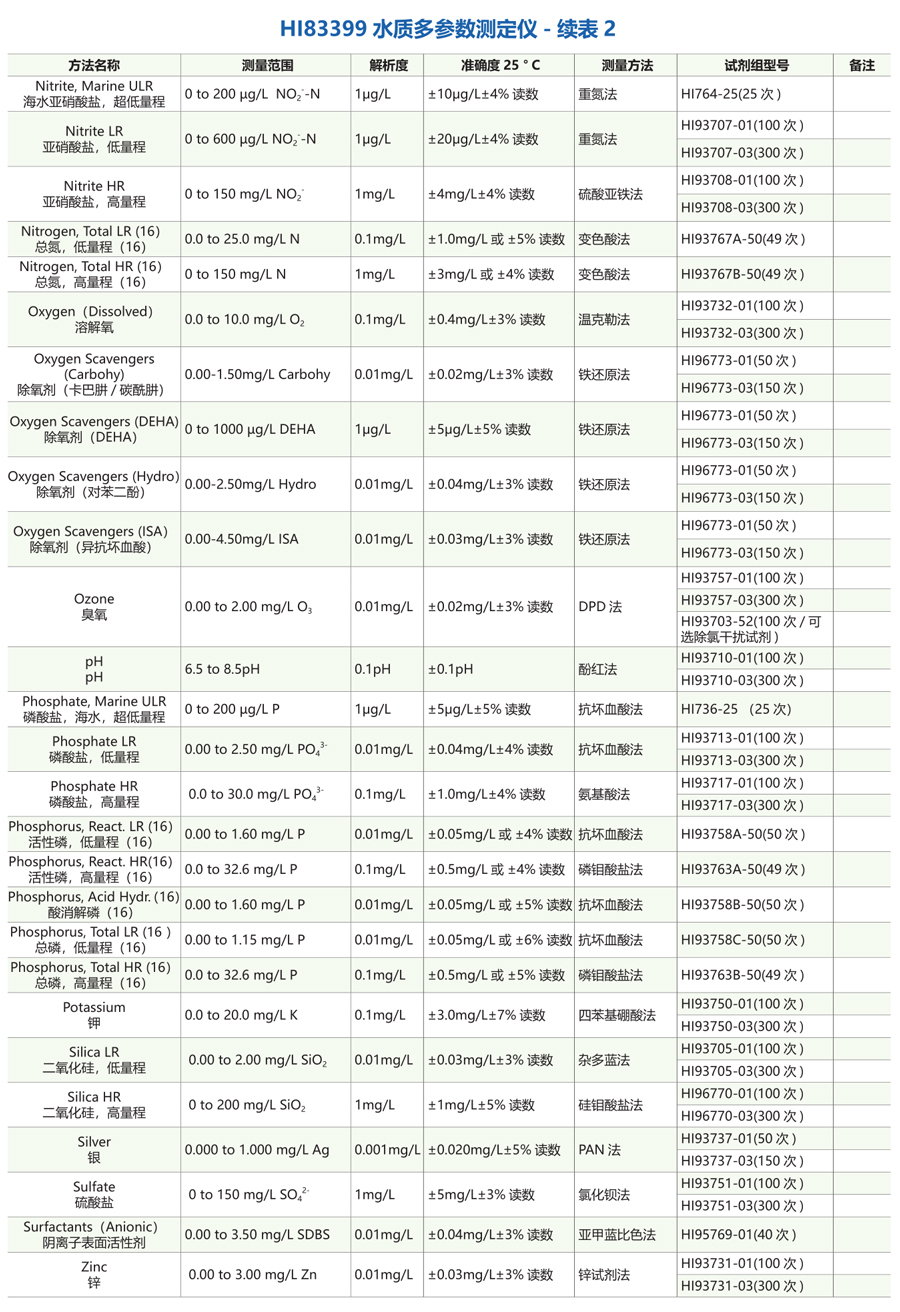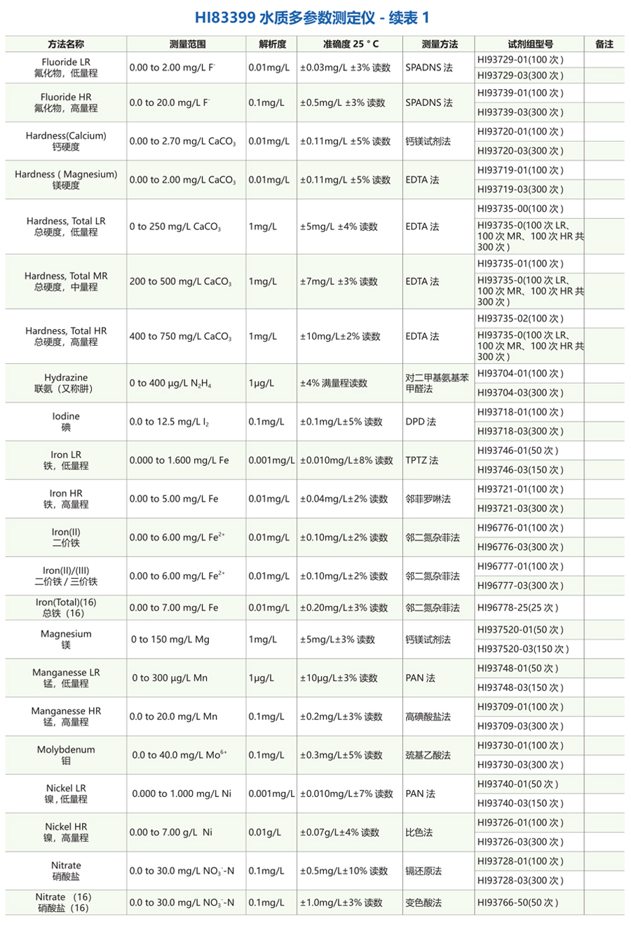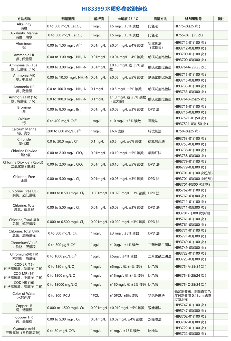 溴Br、碘、磷P、銅Cu、鐵Fe、鈣Ca、鎂Mg、錳Mn、鋁AI、鎳Ni、鉬Mo、鉀K、銀Ag、鋅Zn、堿度、余氯【游離氯】、總氯、氨氮、總氮N、總磷P、聯(lián)氨N2H4、臭氧O3、酸度pH、氯化物、氰尿酸、氟化物、總硬度、鈣硬度、鎂硬度、溶解氧O2、除氧劑、六價鉻Cr、磷酸鹽、硫酸鹽、硝酸鹽【氮】 、二氧化氯、二氧化硅、鉑鈷色度、亞硝酸鹽【氮】 、化學(xué)需氧量COD、陰離子表面活性劑SDBS、吸光度【Abs】等水質(zhì)指標(biāo)快速精確測量。