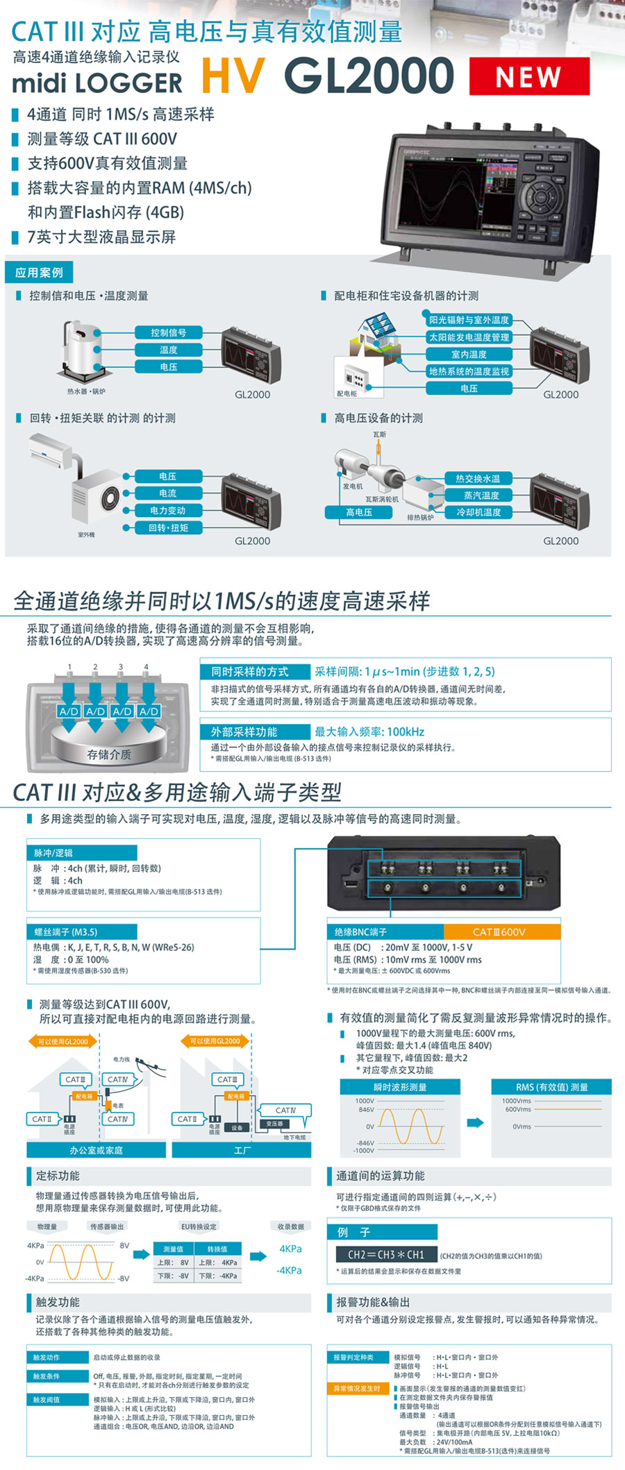 產(chǎn)品描述:日本圖技GL2000多通道數(shù)據(jù)記錄儀是原GL900-4記錄儀的升級產(chǎn)品,新型號可實現(xiàn)高速 1MS/s 的同步采樣,可以高效測量電壓、電流、溫度、壓力、流量和邏輯信號。對應(yīng)CAT III 600V以及600V有效值的測量,支持CAT III 600V測量等級要求,可測量三相電源電壓峰峰,值和RMS值的波動........
