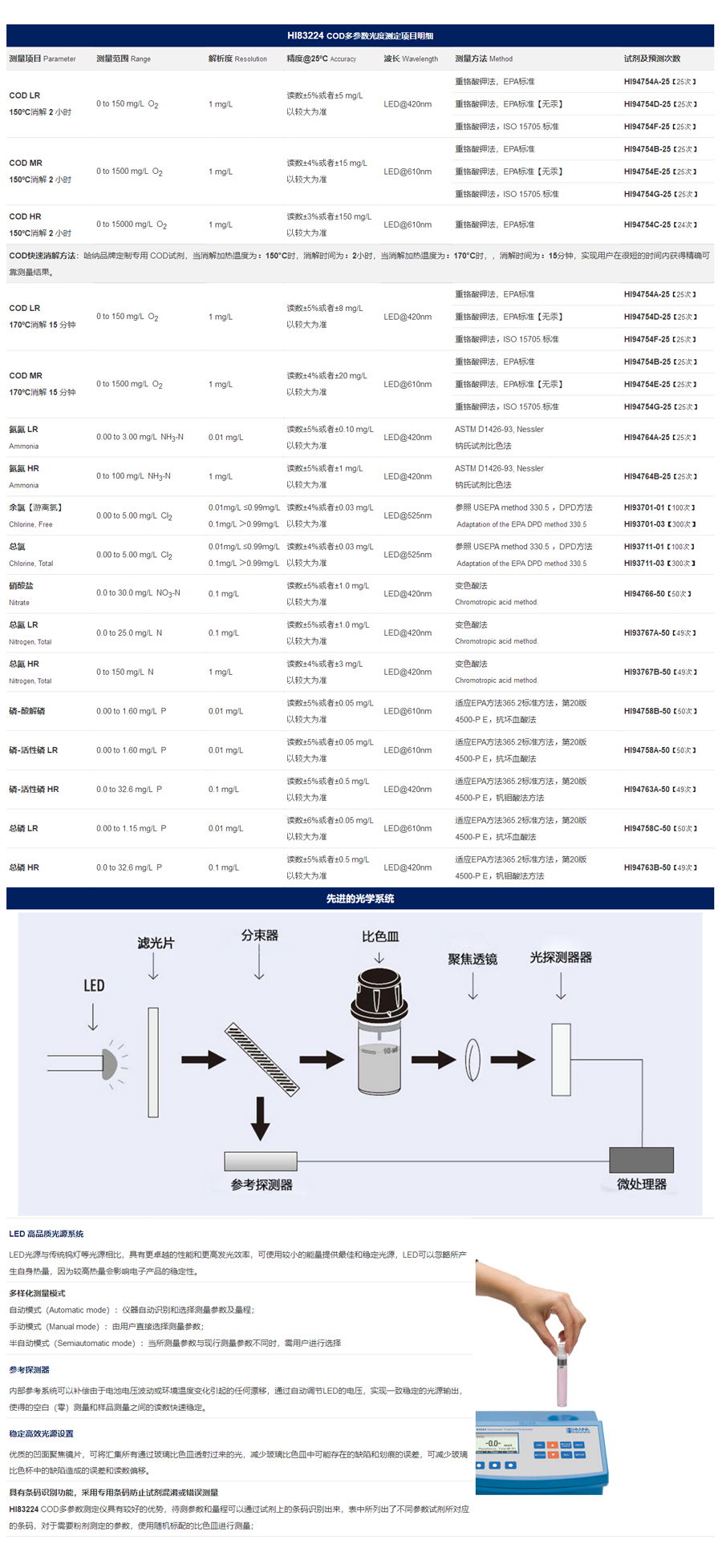 高性能COD多參數(shù)測(cè)定儀,余氯【游離氯】、總氯、氨氮、化學(xué)需氧量 COD、總氮N、總磷P、磷酸鹽【酸解磷、活性磷】、硝酸鹽【氮】重要水質(zhì)指標(biāo)精確快速測(cè)定,使用對(duì)應(yīng)的測(cè)量試劑,通過(guò)試劑上的條形碼,可自動(dòng)識(shí)別測(cè)量項(xiàng)目中所需測(cè)量項(xiàng)目、參數(shù)及測(cè)量范圍,無(wú)需手動(dòng)通過(guò)菜單預(yù)先設(shè)置測(cè)量項(xiàng)目或參數(shù),多樣化測(cè)量模式,條碼識(shí)別功能,采用專用條碼防止試劑混淆或錯(cuò)誤測(cè)量。