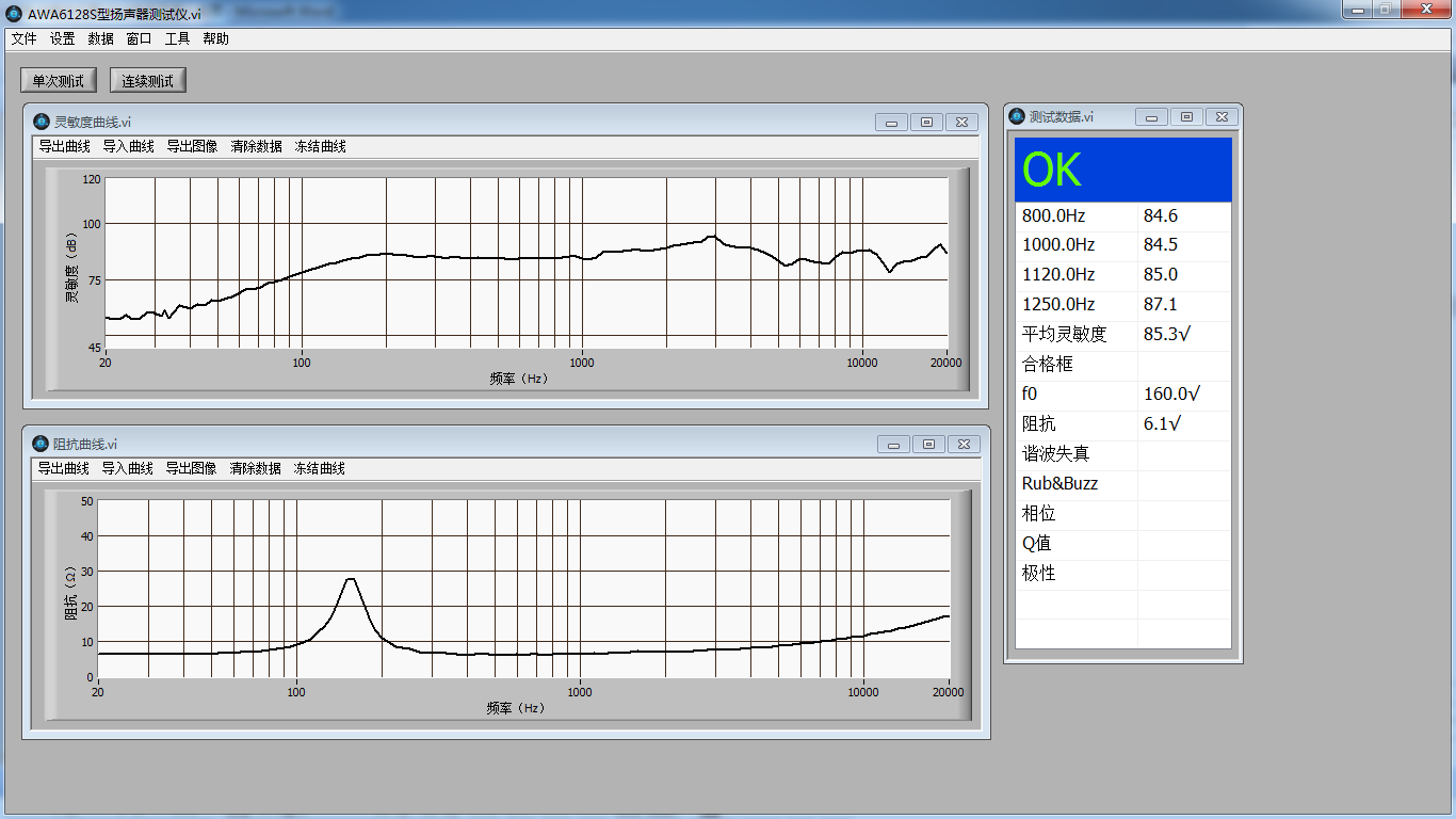 AWA6128S 型揚(yáng)聲器測(cè)試儀執(zhí)行《GB/T 12060.5聲系統(tǒng)設(shè)備:揚(yáng)聲器主要性能測(cè)試方法》(IEC60268-5)標(biāo)準(zhǔn)。該儀器由專(zhuān)用測(cè)量分析電路, PC機(jī)和專(zhuān)用的分析軟件組成,功能強(qiáng)大,操作便捷。充分降低初期成本的投入和維護(hù)費(fèi)用,具有高效、強(qiáng)大的分析和處理能力。能快速地完成電聲產(chǎn)品揚(yáng)聲器的測(cè)試,是基于生產(chǎn)線(xiàn)和質(zhì)量控制(QC)、操作簡(jiǎn)易的要求而開(kāi)發(fā)的測(cè)試系統(tǒng)。它將功率放大模塊,聲音測(cè)量模塊集成在一臺(tái)主機(jī)里,免去了用戶(hù)連線(xiàn)的煩惱。儀器可以同時(shí)測(cè)量揚(yáng)聲器頻響、阻抗、諧波失真、極性、異音等參數(shù)。根據(jù)設(shè)定的門(mén)限判斷揚(yáng)聲器合格品或不合格品。測(cè)試結(jié)束后,簡(jiǎn)潔直觀(guān)的顯示出PASS/FAIL,極大的提高了測(cè)試效率。