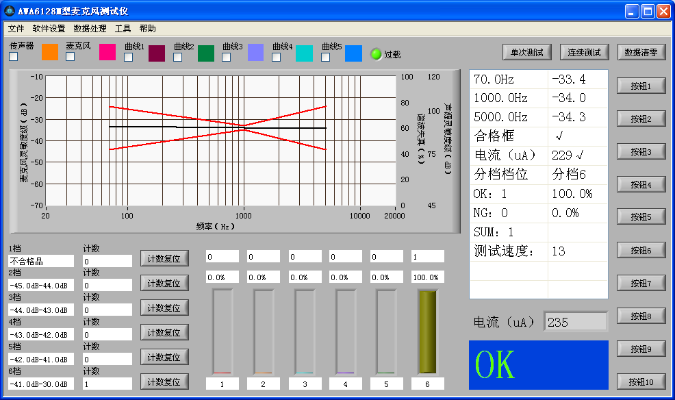 AWA6128M型駐極體傳聲器測試儀主要由測試主機(jī)、帶聲反饋測試傳聲器的測試聲源和控制盒等組成,主要配合分選臺(tái)對駐極體傳聲器(咪頭)進(jìn)行自動(dòng)分類。測試儀同時(shí)測量駐極體傳聲器的低頻靈敏度、1 kHz靈敏度、高頻靈敏度和工作電流等參數(shù)。高頻和低頻測試頻率可自行設(shè)定,也可選擇不測。根據(jù)駐極體傳聲器的中頻靈敏度、低頻上下限、高頻上下限、漏氣、電流等測量結(jié)果對駐極體傳聲器進(jìn)行分類,通過串口輸出分檔指令給分選臺(tái),并統(tǒng)計(jì)分類結(jié)果。簡潔直觀地顯示 PASS/NG測量結(jié)果,自動(dòng)判斷良品和不良品,極大的提高了測試效率。聲反饋測試傳聲器同時(shí)測量聲源的聲壓,反饋控制信號(hào)源的輸出,使聲源聲壓保持恒定,從而排除由于測試聲源聲信號(hào)的不穩(wěn)定而造成的測試結(jié)果前后變化。