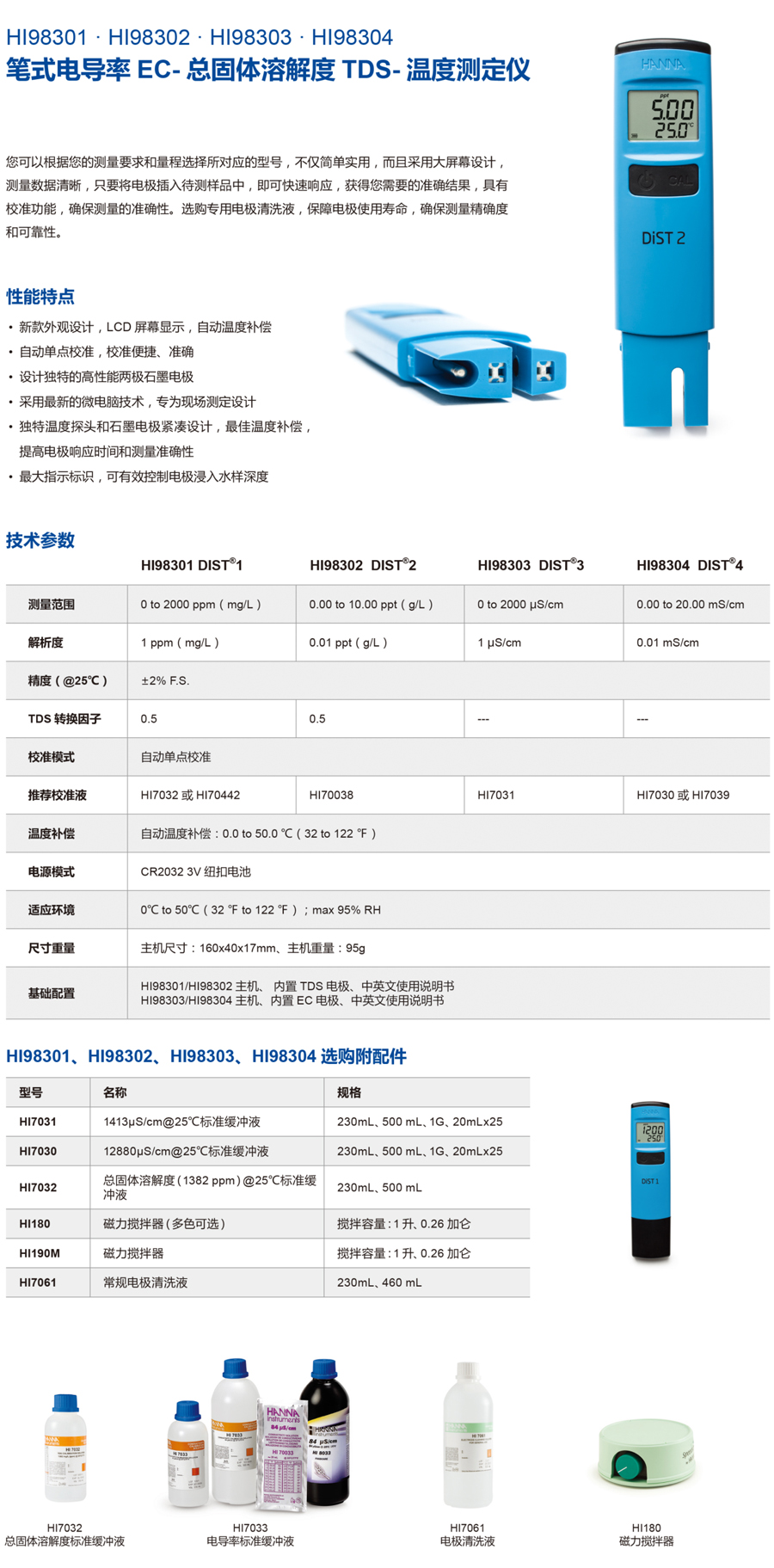 主機(jī),內(nèi)置電導(dǎo)率EC電極,HI70030 袋裝電導(dǎo)率標(biāo)準(zhǔn)緩沖液,規(guī)格:20mL,中英文使用說(shuō)明書(shū),HI721318 專用攜帶盒
