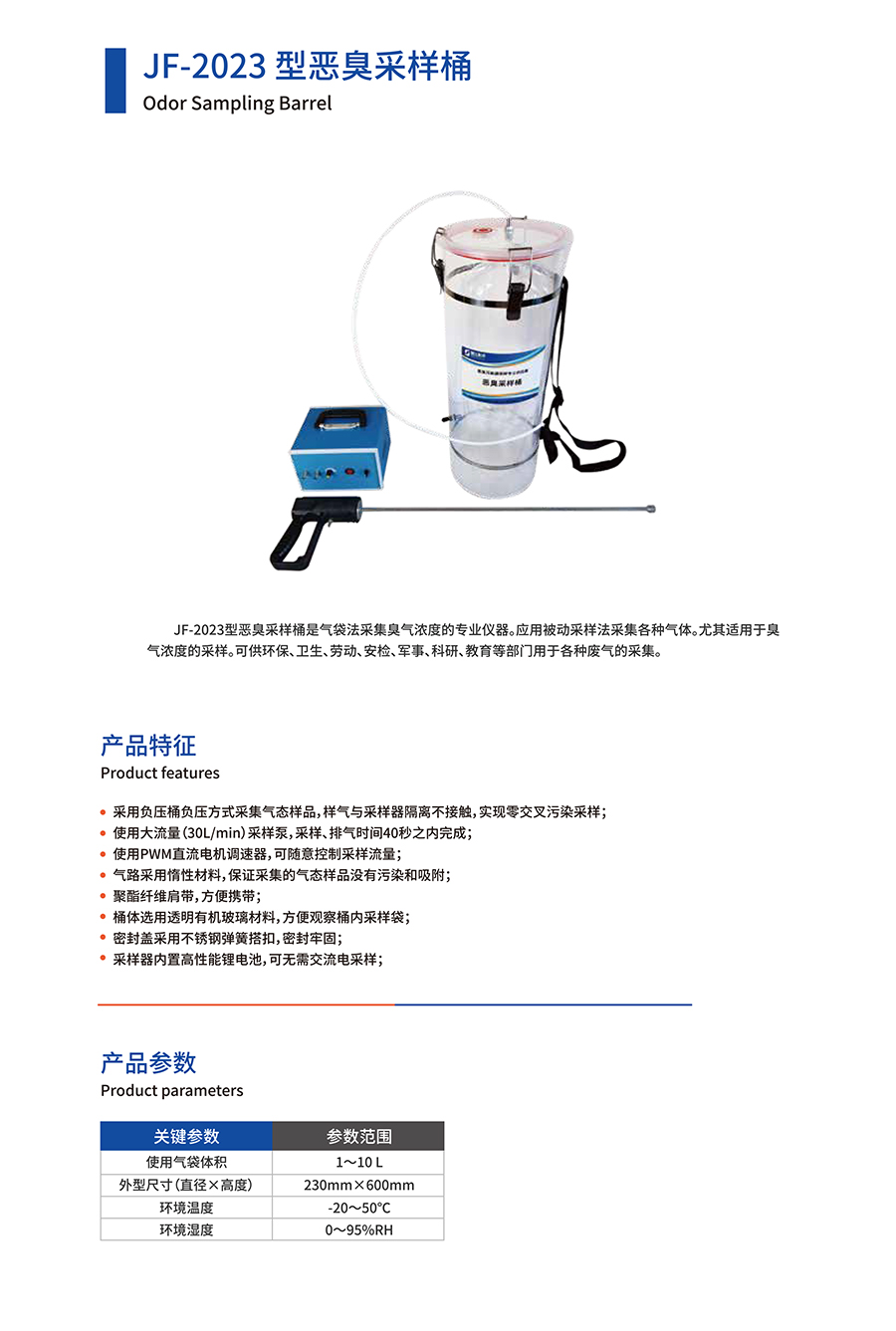 產(chǎn)品描述:JF-2023型惡臭采樣桶是氣袋法采集臭氣濃度的專業(yè)儀器。應(yīng)用被動(dòng)采樣法采集各種氣體。尤其適用于臭氣濃度的采樣??晒┉h(huán)保、衛(wèi)生、勞動(dòng)、安檢、軍事、科研、教育等部門(mén)用于各種廢氣的采集。